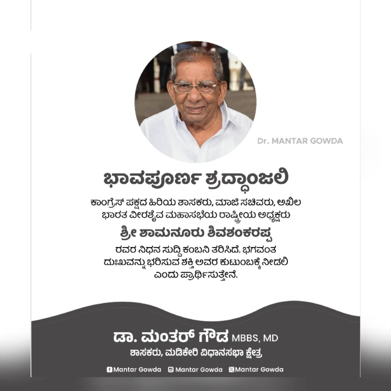 ಅಖಿಲ ಭಾರತ ವೀರಶೈವ ಮಹಾಸಭೆಯ ರಾಷ್ಟ್ರೀಯ ಅಧ್ಯಕ್ಷರಾಗಿದಾವಣಗೆರೆ ದಕ್ಷಿಣ ವಿಧಾನಸಭಾ ಕ್ಷೇತ್ರದ ಶಾಸಕರು, ಮಾಜಿ ಸಚಿವರು ಹಾಗೂ ನಮ್ಮ ಕಾಂಗ್ರೆಸ್ ಪಕ್ಷದ ಹಿರಿಯ ನಾಯಕರಾದ ಶ್ರೀ ಶಾಮನೂರು ಶಿವಶಂಕರಪ್ಪನವರ ನಿಧನದ ಸುದ್ದಿ ಮನಸ್ಸಿಗೆ ಆಘಾತ ತಂದಿದೆ.