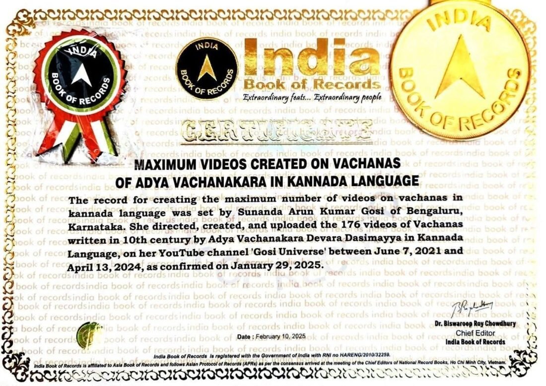 ಶ್ರೀಮತಿ ಸುನಂದ ಅರುಣ್ ಕುಮಾರ್ ಗೋಸಿ ಅವರು ಆದ್ಯ ವಚನಕಾರ ದೇವರ ದಾಸಿಮಯ್ಯನವರ ಎಲ್ಲಾ 176 ವಚನಗಳನ್ನು ಪ್ರಸಿದ್ಧ ಗಾಯಕ ಗಾಯಕಿಯರಿಂದ ಹಾಡಿಸಿ ಭಾವಾಥ೯ ಸಹಿತ ದೃಶ್ಯಿಕರಿಸಿ ಯೂ ಟ್ಯೂಬ್ ನಲ್ಲಿ ಹಾಕಿ ಇಂಡಿಯನ್ ಬುಕ್ ಆಫ್ ರೆಕಾರ್ಡ್ ದಾಖಲೆ ಮಾಡಿದ್ದಾರೆ.